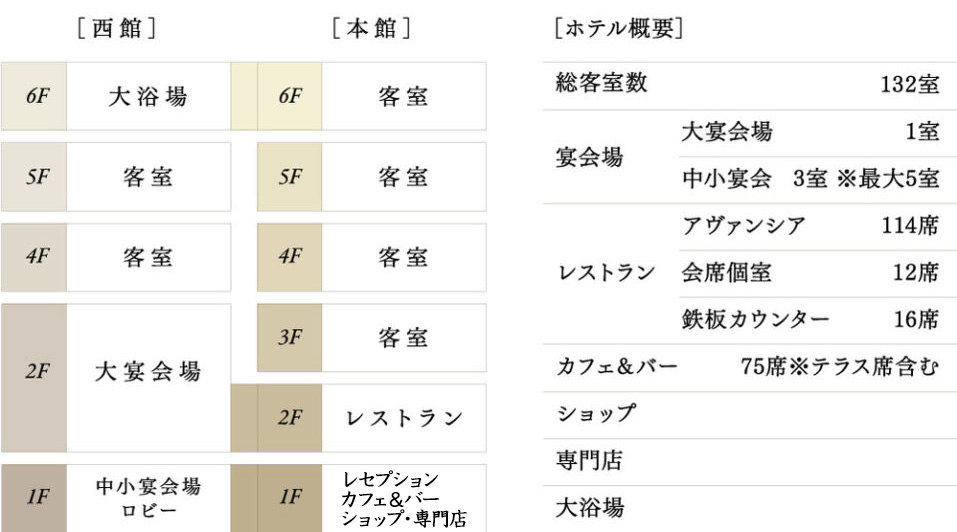 ホテル内ならではの ゆったりとした空間に 新ブランドを数多く取り入れ、皆様をお迎えいたします。