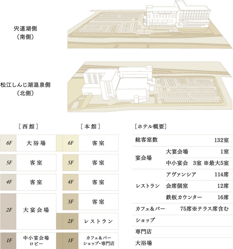 6階には展望大浴場を備え、客室のある4階・5階には、 和室やゆったりとしたツインルームなど、 ご利用シーンに合わせ便利な多彩な客室がございます。 いづれも宍道湖に面したお部屋です。