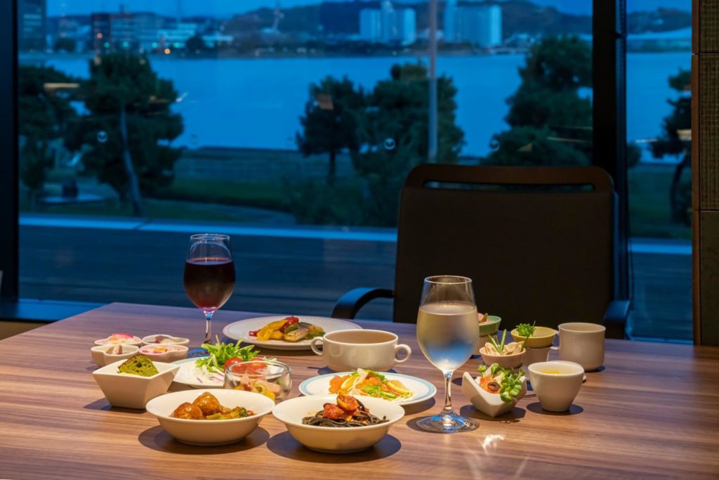夕食は鉄板焼きディナー。しまね和牛や伊勢海老、美味しいお料理とワインと一緒に。